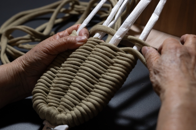 妥協をゆるさず、編みあがった草履に手をいれ、編み目をさらに整えていらっしゃいます。