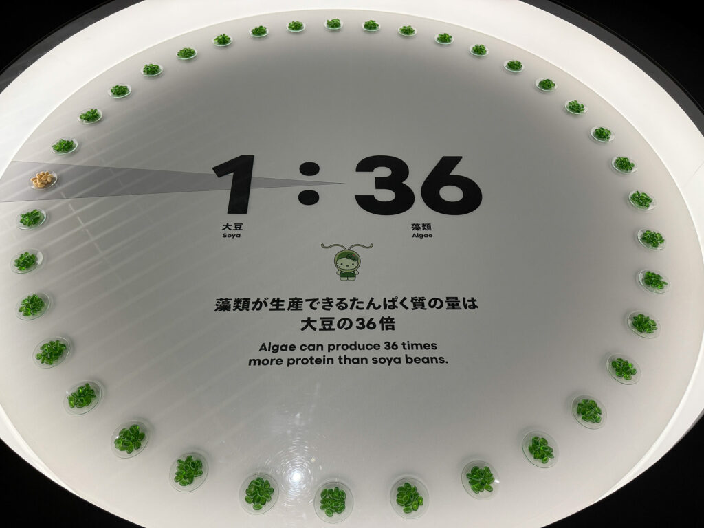 最新のバイオテクノロジー(藻類など)を活用して、食品や資源を効率的に生産する様子が展示されています