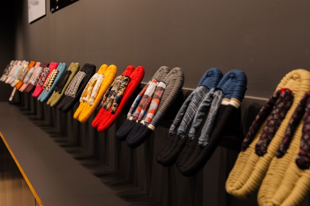 MERIは、まず企画から始まり紐を編み、草履を編み、鼻緒を作り、鼻緒をつけ、そしてお店に並びます。多くの手から手へと渡って1足が完成するのです。